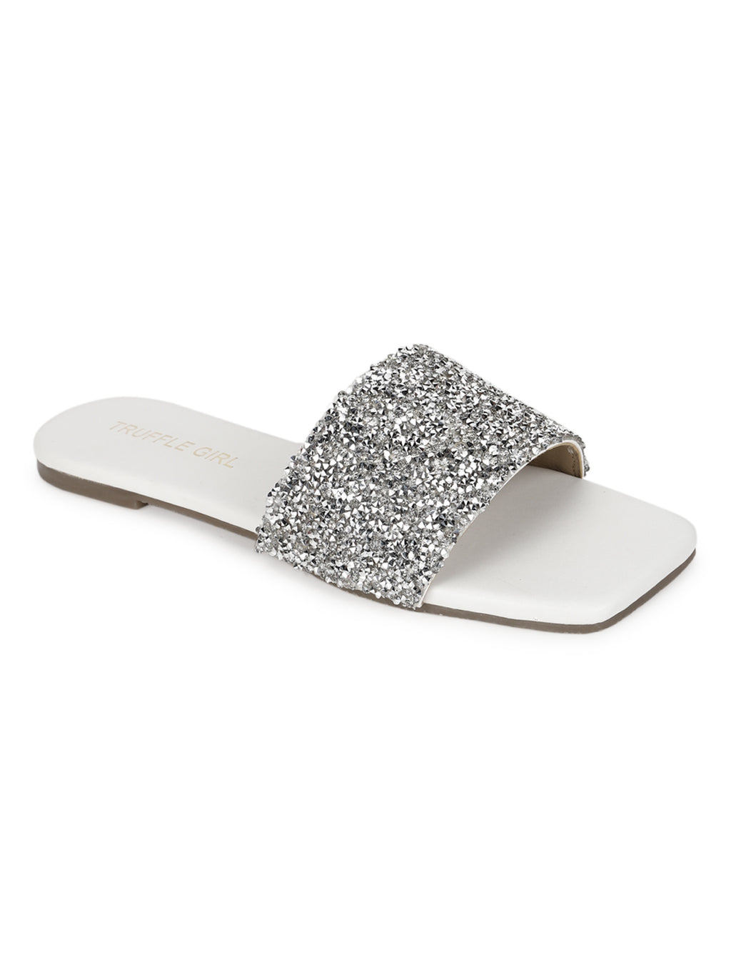 White PU Sequin Glitter Strap Slip On Flats (TC-ST-1211-WHT)